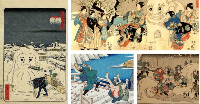 Сейчас делают снежных баб (только из двух шаров), если такая возможность вообще есть. Вот разгадка тайны двух шаров -- по-японски снежная баба называется "юки-дарума", и  во времена Утагавы Хиросигэ делали настоящие куклы-дарума из снега.